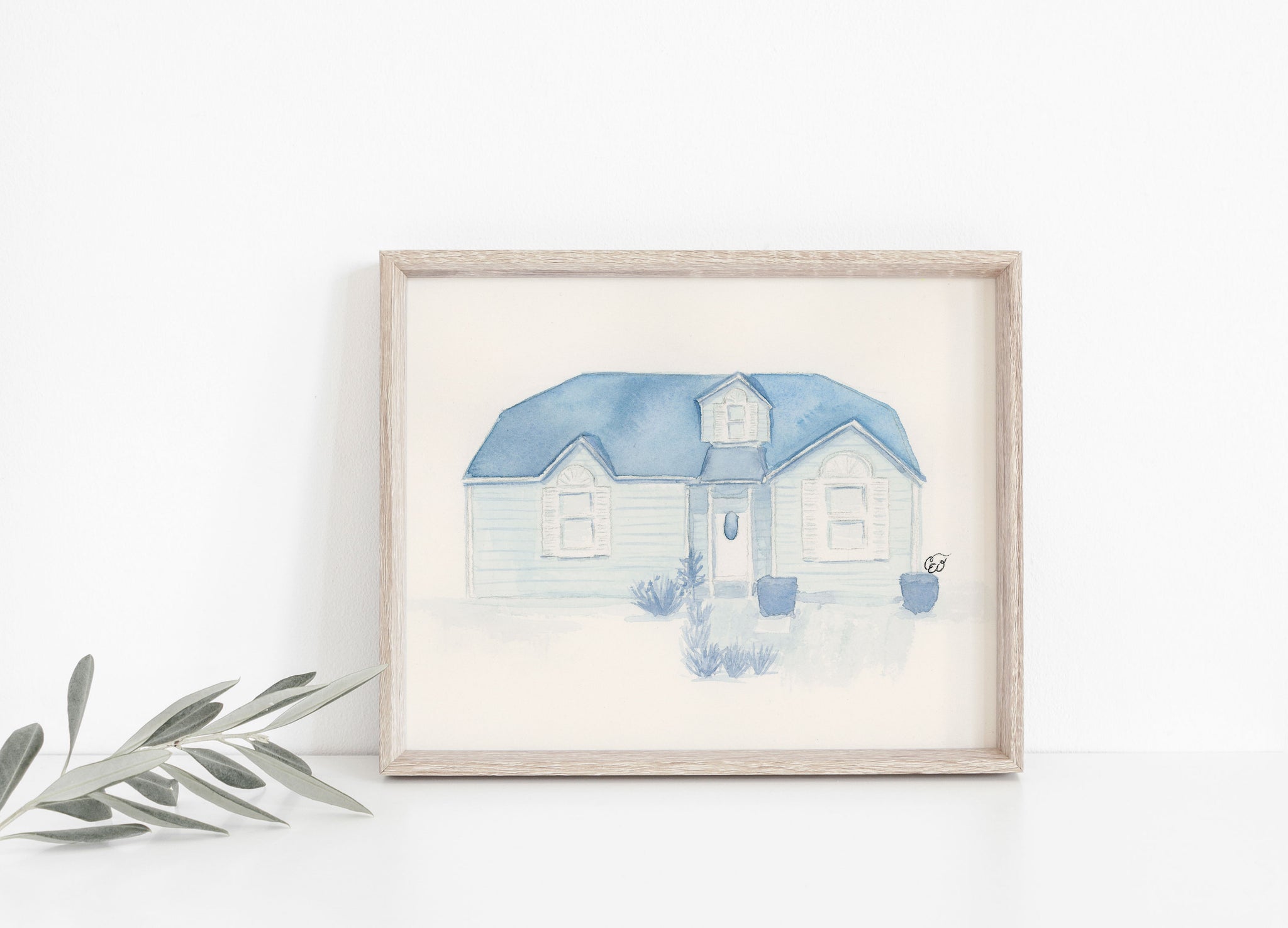 An 8x10 custom original watercolor painting of your home created by Chrissy O'Neill in an all blue chinoiserie-style on beautiful 140 lb cold pressed watercolor paper.
